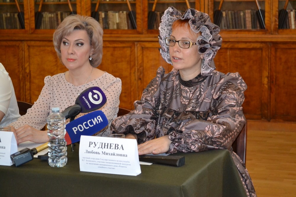 Научный сотрудник Государственного музея-усадьбы В.Г. Белинского, участник театрализованной экскурсии по экспозиции мемориального дома «Рецепты семейного счастья» Любовь Руднева предстала на пресс-конференции в образе Сашеньки Белынской и раскрыла подробности этого зрелищного мероприятия.