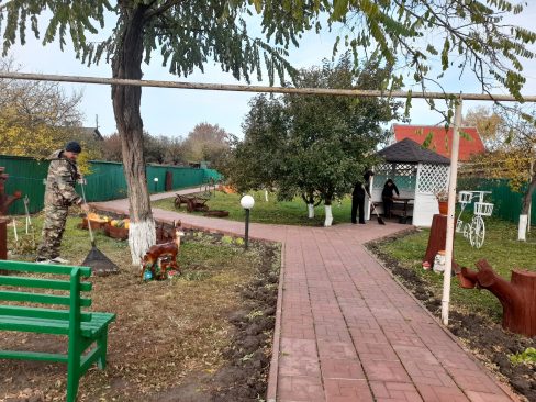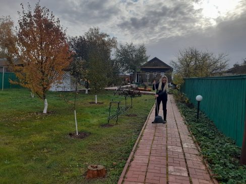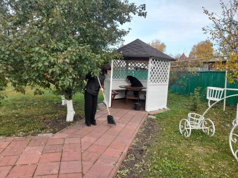 11 октября — суббота, день, когда в музей приезжают экскурсионные автобусы. Сотрудники музея делают все для комфортного пребывания гостей не только в музее, но и на его территории. В перерывах между приемами экскурсионных групп сотрудники подмели дорожки и помыли беседку в Купринском саду.
