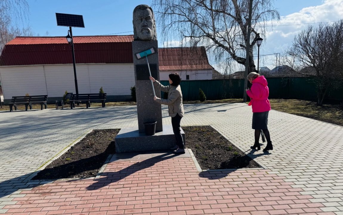 У здания Выставочного зала помыли бюст писателя и подготовили территорию для посева газонной травы.