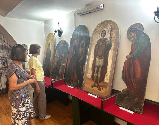 Вниманию посетителей представлена часть композиции «Голгофа» плоская вырезанная фигура Иоанна Крестителя. Характерным стилем написания икон начала XVIII века является «барокко», в котором выполнены работы «Богородица» и «Архангел Гавриил». Особое внимание привлекает икона второй половины XIX века с нетрадиционным сюжетом «Ангел Господень с иконой Богоматери Казанской в руках». На выставке экспонируется икона «Святых великомучеников Николая, Дмитрия, Петра», которая украшала иконостас в трапезной храма Преображения Господня. Привлекает внимание посетителей икона «Святых великомучеников Иакова, Фомы, Симона Зилота», написанная в стиле фресковой росписи храма. Представленные на выставке иконы являются важными объектами духовности и символами веры, к которым обращались и прикладывались в радостные и печальные минуты господа Радищевы в своей родовой церкви.