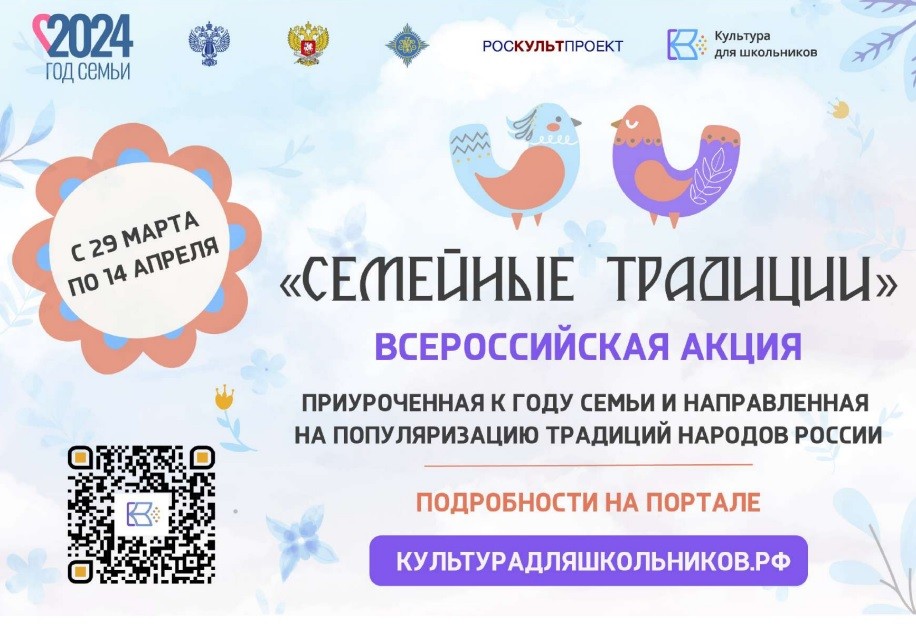 С 29 марта по 14 апреля 2024 г. в рамках межведомственного культурнообразовательного проекта «Культура для школьников» пройдет Всероссийская акция «Семейные традиции», приуроченная к Году семьи и направленная на популяризацию традиций народов России.