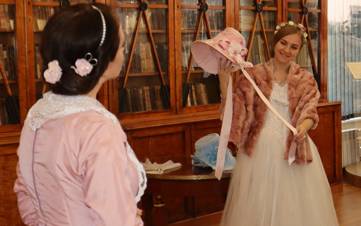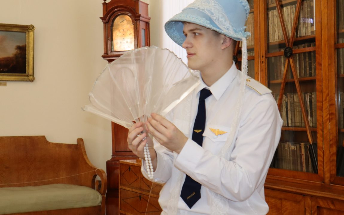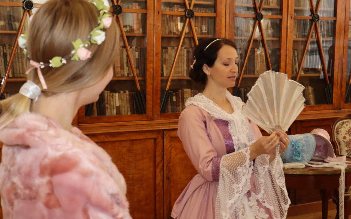 Нарядные дамы поделились с пензенскими студентами тайным языком веера, знаками, которые использовали на балах, и значении шляпных лент. В завершение мероприятия гости поиграли в модную салонную игру «Амур летит».
