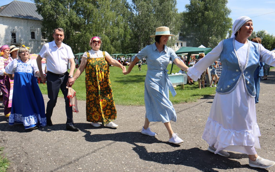 В этом году праздник открыли «хлебом-солью» и зажигательным хороводом, который дружной вереницей проводил почётных гостей мероприятия к сцене на торжественное открытие фольклорного праздника «Тихвинская ярмарка».
