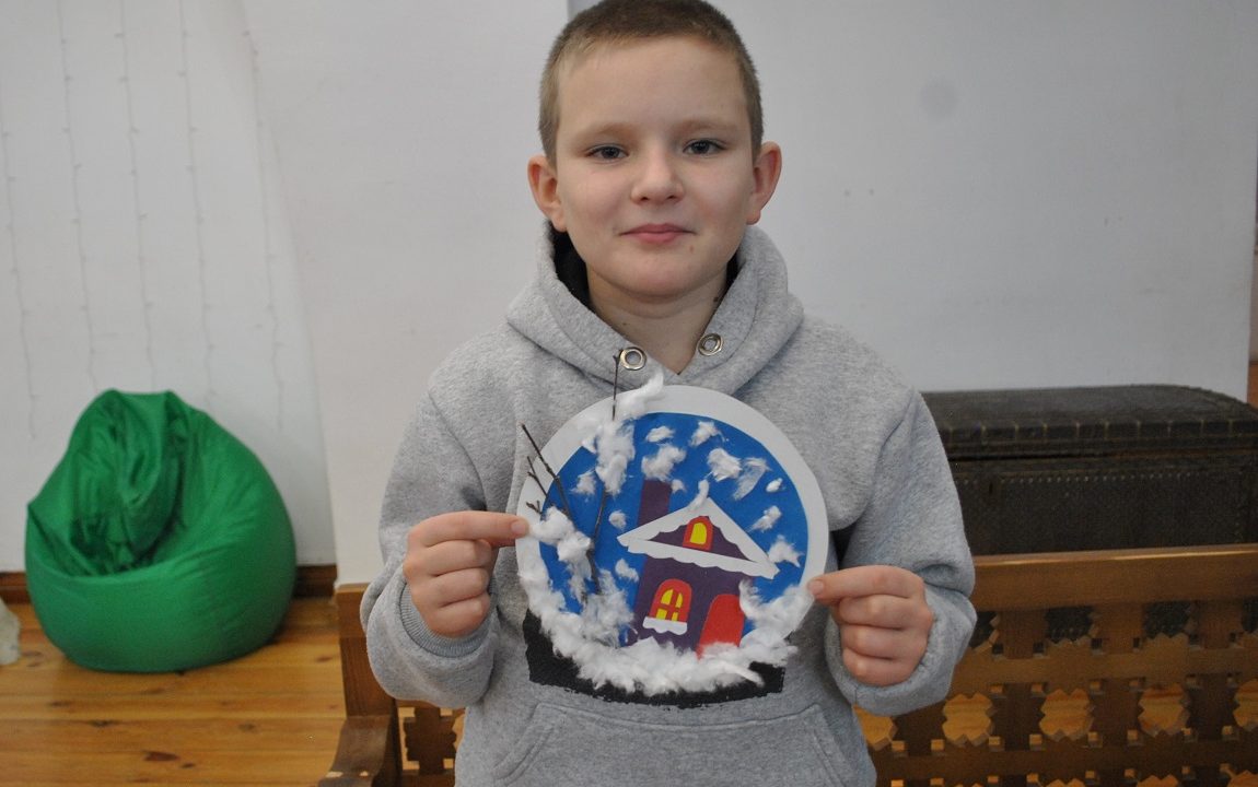 В начале мероприятия юных посетителей ждали загадки о зиме, снеге, елочке и снежинках. Дети познакомились с историей зимних праздников и узнали, что снежинка – главный атрибут зимней сказки и прекрасное изящное украшение не только елки, но и интерьера в целом. Участники мастер-класса сделали своими руками объемную поделку «Зимний домик». Материалом послужили: цветная бумага, сухие веточки, вата, клей ПВА.