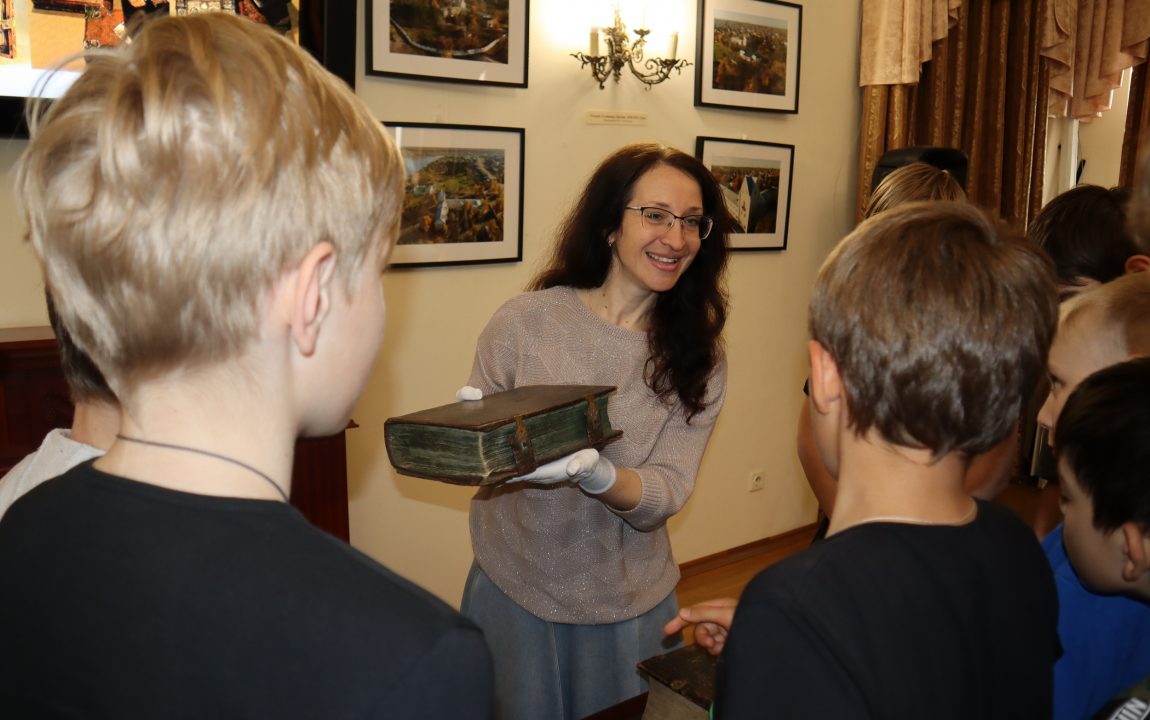 В ходе познавательной лекции ученики православной гимназии попробовали самостоятельно начертать перьями славянские буквы и рассмотрели книги XVIII века из собрания музея, облаченные в кожаные переплеты.