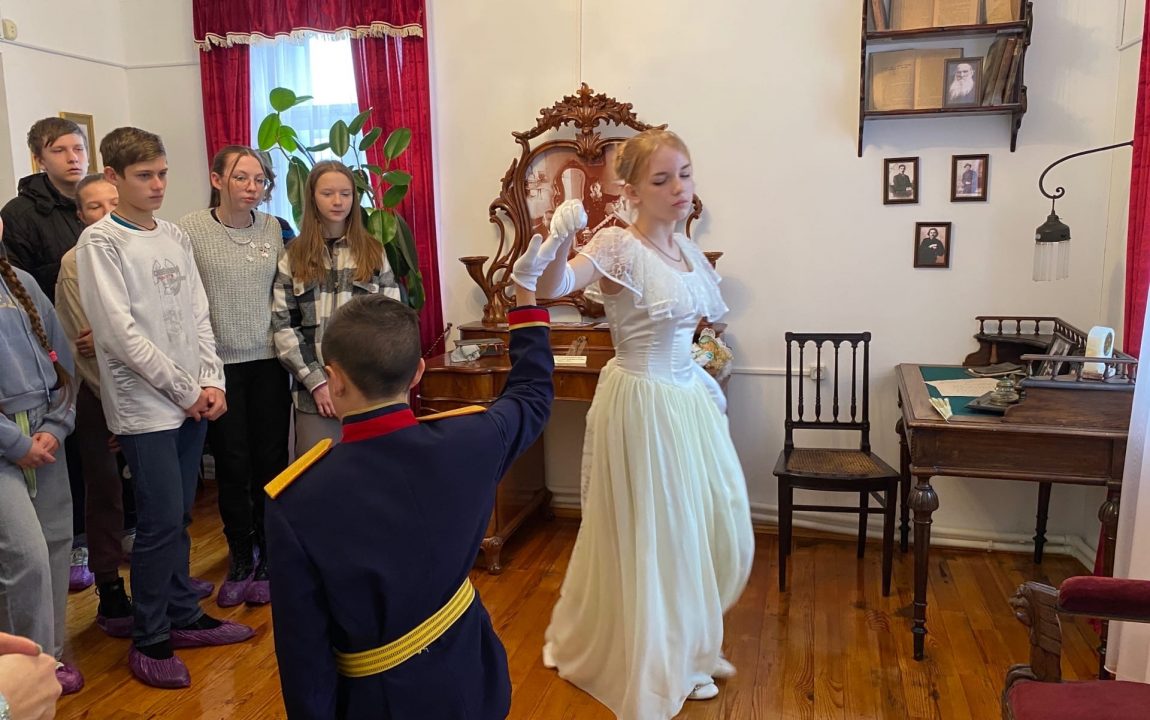Дети познакомились с юношеской любовью Куприна — Юленькой Синельниковой, от которой узнали интересные подробности о юнкере и посмотрели фрагмент «Юнкерского бала».