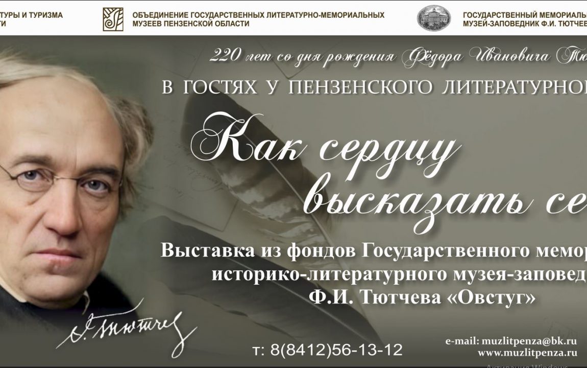 22 ноября 2023 года, в среду, в 15:00 в Пензенском литературном музее состоится открытие выставки «Как сердцу высказать себя…». Выставочный проект, предоставленный Государственным мемориальным историко-литературным музеем-заповедником Ф.И. Тютчева «Овстуг», приурочен к 220-летию со дня рождения знаменитого русского поэта, дипломата и публициста.