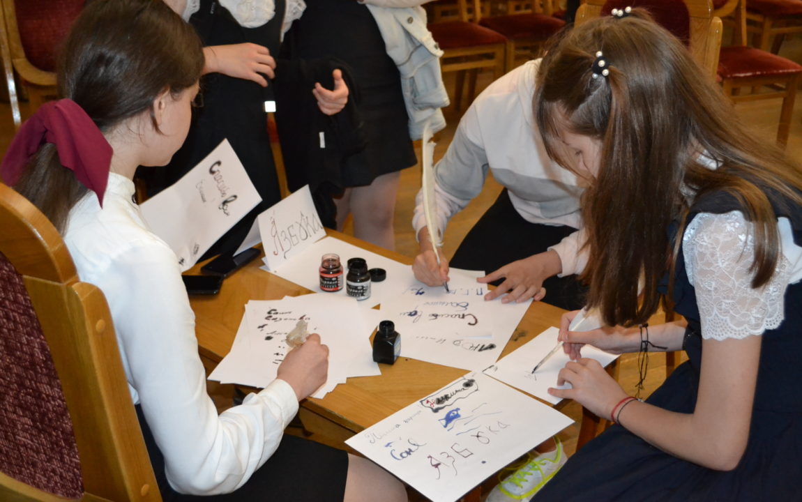 Также у участников встречи была возможность научиться писать буквы славянской азбуки. Пером и чернилами гимназисты старательно выводили слова, как предки столетия назад.