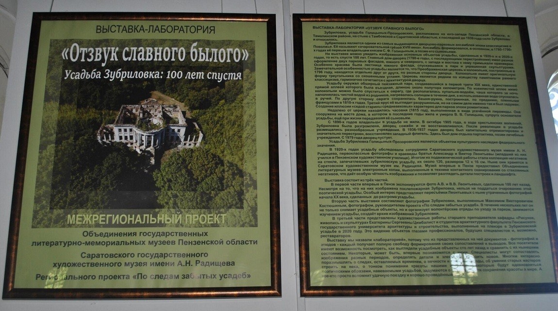 На выставке можно увидеть изображения основных объектов усадьбы Голицыных-Прозоровских Зубриловка, расположенной на юго-западе Пензенской области, в Тамалинском районе.