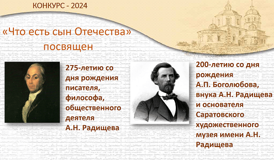 Творческий конкурс «Что есть сын Отечества» в 2024 году проводится в рамках мероприятий, посвящённых 275-летию со дня рождения писателя, философа, общественного деятеля Александра Николаевича Радищева и 200-летию со дня рождения Алексея Петровича Боголюбова, внука А.Н. Радищева и основателя Саратовского художественного музея имени А.Н. Радищева.