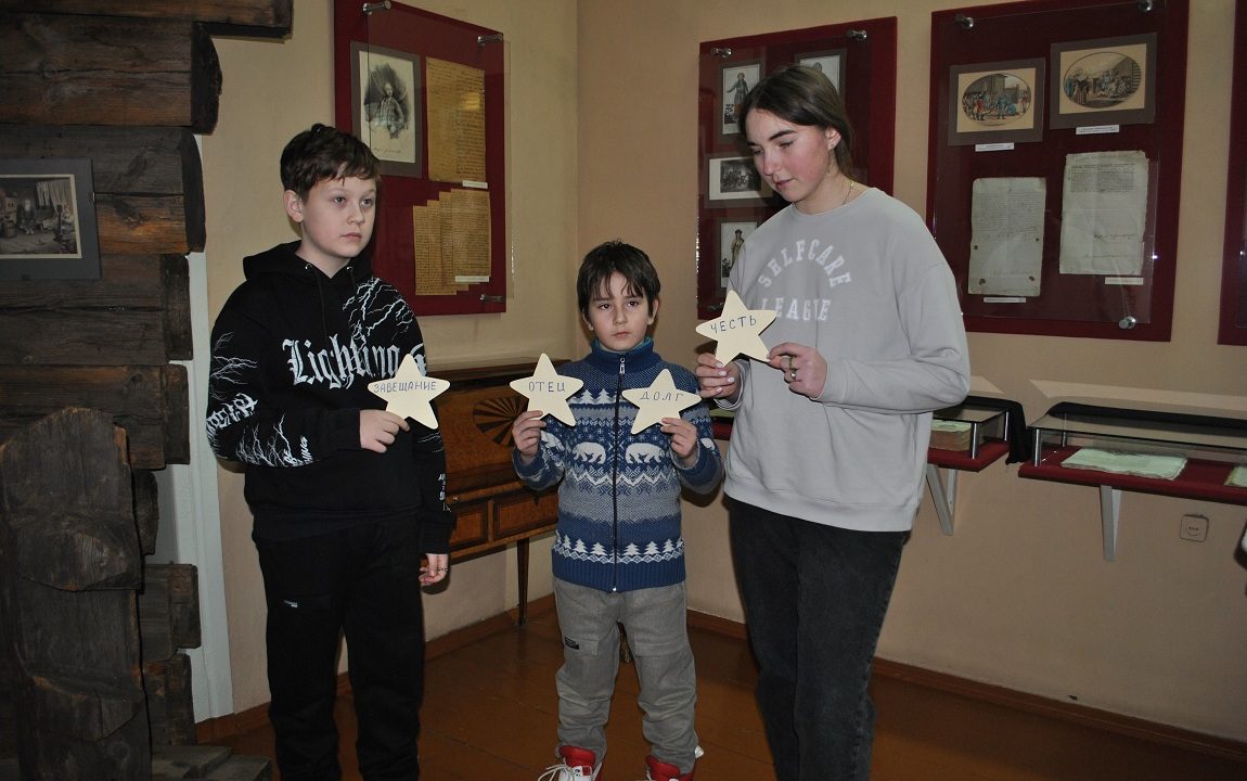 В течение мероприятия ребята отгадывали загадки, участвовали в викторине на военную тематику, с интересом рассмотрели орден святого Владимира IV степени из фондов музея, подготовили солдатский обед, перебрав крупу, и выполнили ещё немало заданий, которые привели их к составлению ключевой фразы: «Нам долг и честь завещаны отцами».