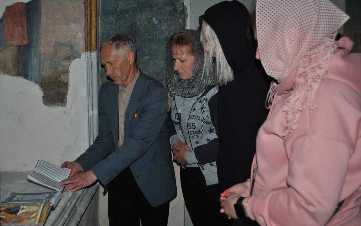 Экскурсовод музея Паршин Н.Н. рассказал посетителям, как библейская притча о блудном сыне связана с жизнью Александра Радищева и растолковал значение других фресок храма Преображения Господня.