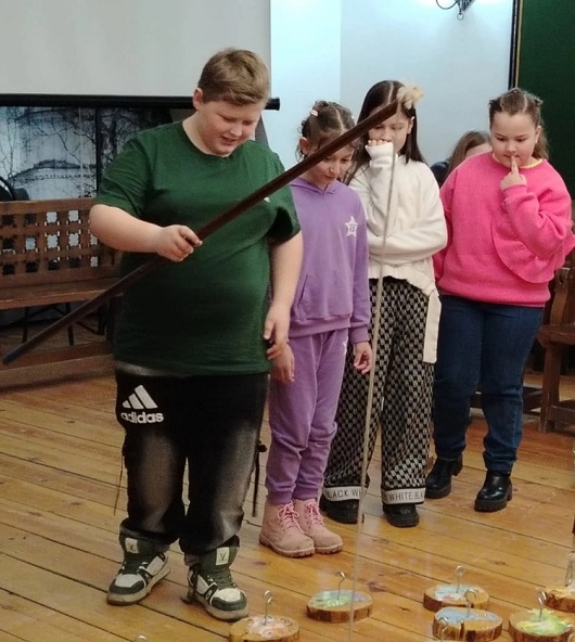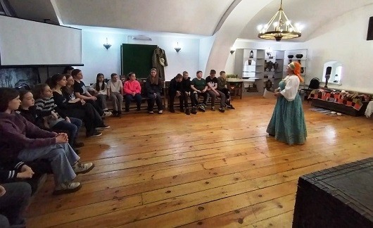 Специалисты музея познакомили ребят с предметами быта, обычаями и традициями наших предков. В ходе программы дети вспоминали пословицы и поговорки, разучивали потешки и скороговорки, разгадывали загадки, принимали участие в сказочной викторине, старинных народных играх и хороводах и, создав свой ансамбль народных инструментов, исполнили весёлую русскую народную мелодию.