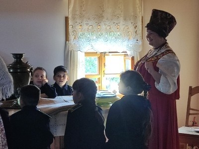 Ребята окунулись в атмосферу старинного русского быта: с восторгом знакомились с традициями Покрова, отгадывали мудреные загадки, пробовали дары осени и даже рубили капусту. И, конечно, не обошлось без блинов по старинному рецепту хозяйки дома.
