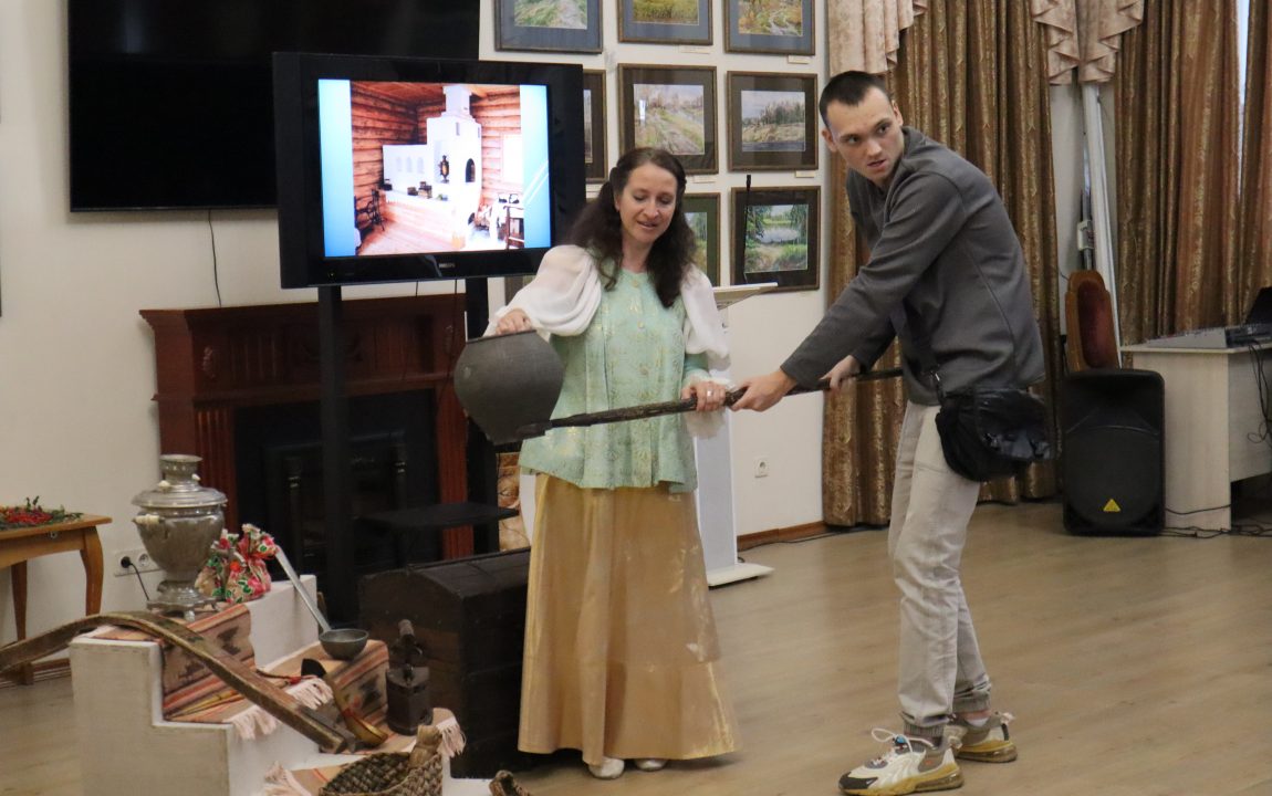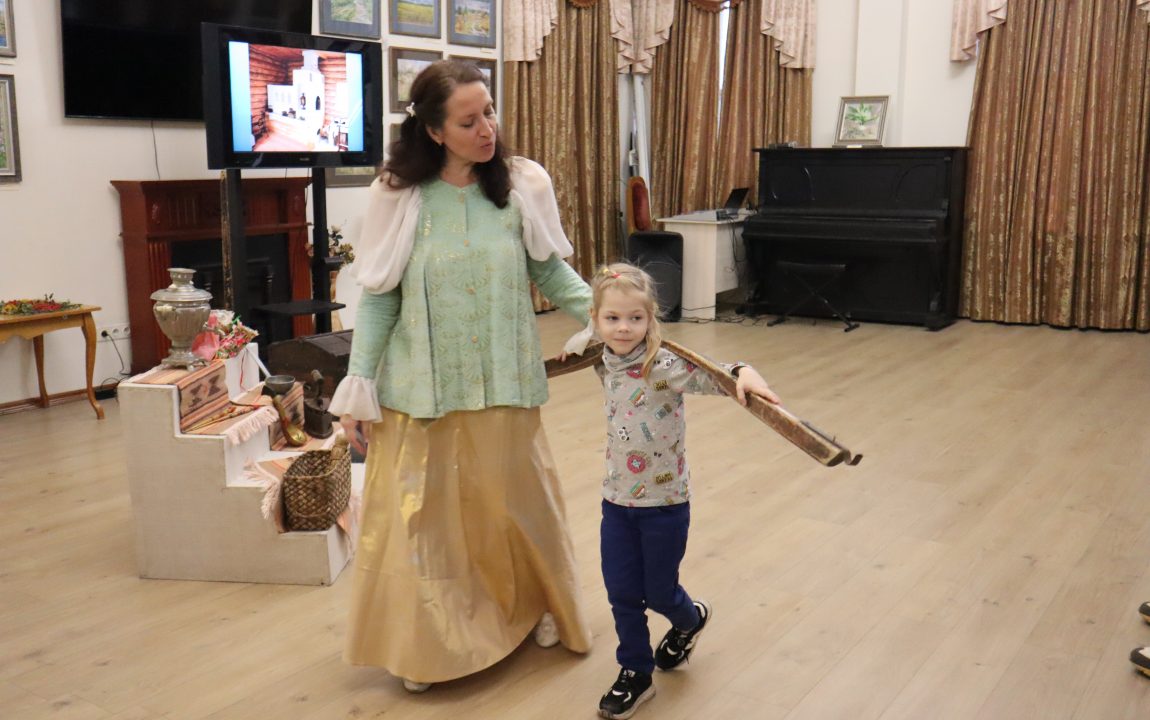Ребята узнали, как наши предки использовали предметы народного быта, например, самовар, коромысло, чугунок, ухват, а также лапти, рушник. Все эти предметы посетители могли потрогать. Сотрудник музея также рассказала ребятам, в каких русских народных сказках встречаются представленные предметы.