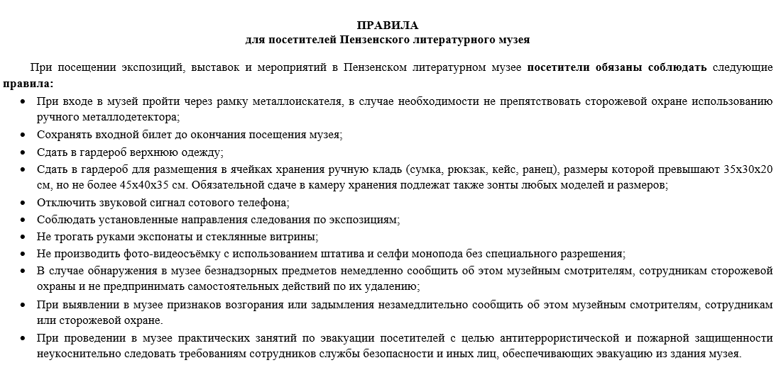 При посещении экспозиций, выставок и мероприятий в Пензенском литературном музее посетители обязаны соблюдать следующие правила: